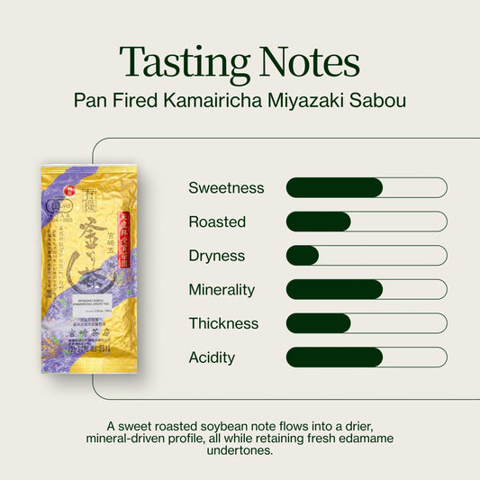 Il sapore del Kamairicha gioca maggiormente su note di nocciola, con sapori di mandorle, anacardi tostati e alghe tostate. Questo tè è eccezionale nel combinare i profili di gusto più caldi dei tè completamente tostati, con i sapori più freschi e vegetali dei tè non tostati.