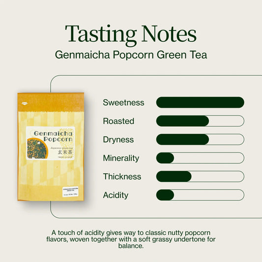 Il genmaicha gioca su note calde di cereali, con un sapore simile alla farina d'avena o ai fiocchi di mais. Il tè presenta una leggera dolcezza amidacea, seguita da alcune note più erbacee, a seconda del tipo di foglie di tè utilizzate.