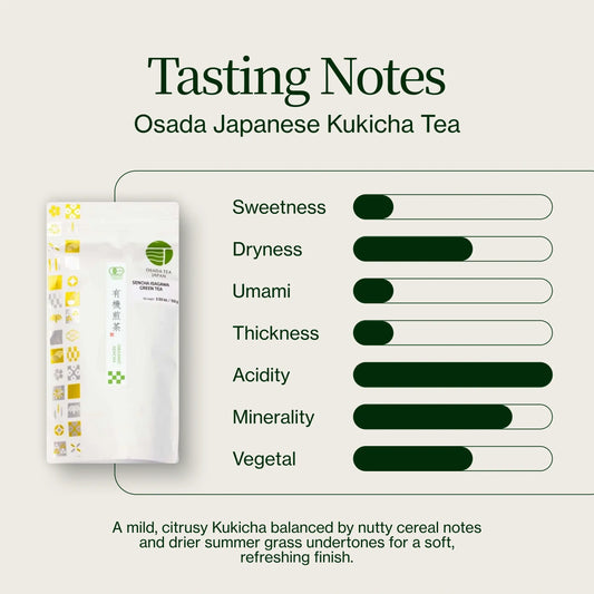 Il tè Kukicha è un tè verde ottenuto dagli steli e dalle foglie della pianta del tè. Mescolando i gambi nel tè, gli agricoltori sono in grado di produrre un tè a basso contenuto di caffeina con un profilo aromatico più delicato, simile al fieno o alla paglia. Questi tè tendono ad essere più ricchi di minerali, e puoi sentire questa mineralità avvertendo una sensazione di formicolio al palato.