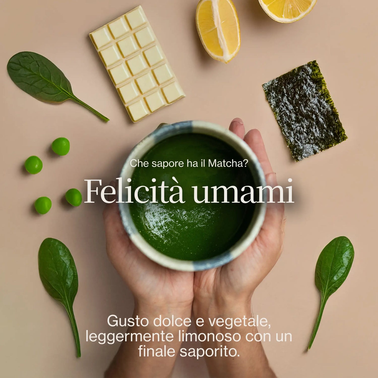 Aspettatevi un gusto raffinato con una miscela armoniosa di dolcezza naturale, note vegetali e umami. Ogni porzione di matcha di grado cerimoniale è macinata a pietra e lavorata finemente per offrire un'esperienza morbida e lussuosa ad ogni sorso.