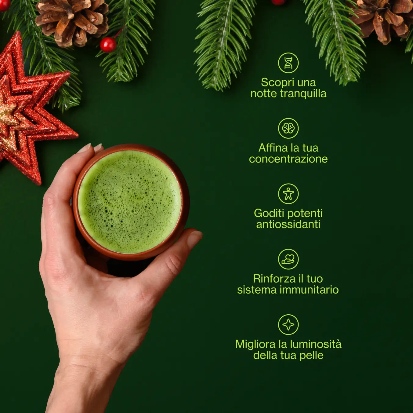 Il matcha è ricco di potenti antiossidanti, caffeina naturale e aminoacidi calmanti che forniscono energia sostenuta, lucidità mentale e un senso di calma concentrazione. Favorisce il benessere generale, stimola il metabolismo e promuove un sistema immunitario sano, rendendolo l'aggiunta perfetta alla vostra routine quotidiana o al vostro rituale festivo.